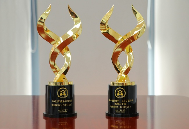11月23日至24日,由中国证券报、南通市人民政府主办的2023上市公司高质量发展论坛暨第二十五届上市公司金牛奖颁奖典礼,由中国证券报、中国国新控股有限责任公司、南通市人民政府主办的2023金牛企业可持续发展论坛暨第一届国新杯·ESG金牛奖颁奖典礼在江苏南通举行。有研粉材凭借优异的科技创新和金属粉体制备领域技术优势等突出表现,荣获“2022年度金牛科创奖”和“第一届国新杯·ESG金牛奖新锐二十强”。