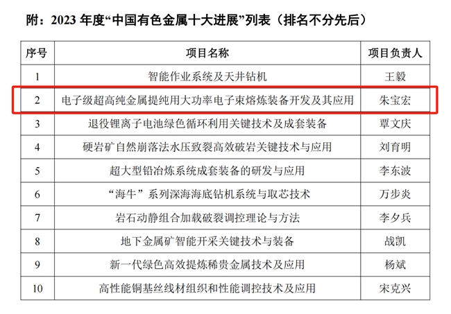 12月13日,中国有色金属学会揭晓2023年度“中国有色金属十大进展”获奖名单,中国有研所属有研工研院“电子级超高纯金属提纯用大功率电子束熔炼装备开发及其应用”项目成功入选。