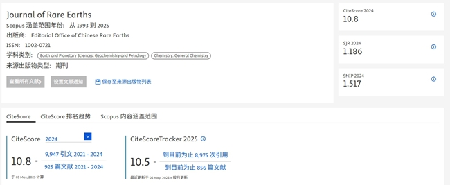 《稀土学报(英文)》2024年度CiteScore™为10.8,同比提升24%,双Q1区,其中在Geochemistry and Petrology领域排名6/163(前5%);在General Chemistry领域排名52/404(前15%)。