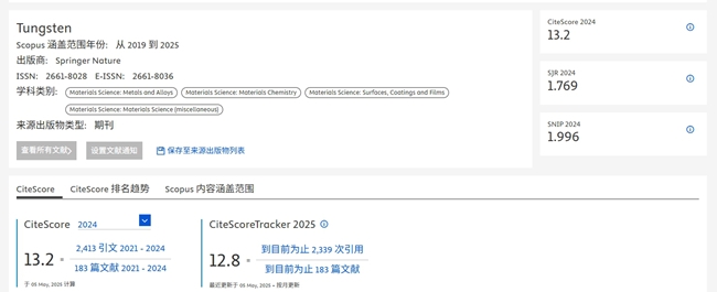 《钨科技(英文)》2024年度CiteScore™为13.2,同比提升50%,在4个领域位于Q1区,其中在Metals and Alloys领域排名13/175(前10%);在Materials Chemistry领域排名30/324(前10%);在Surfaces,Coatings and Films领域排名14/132(前15%);在Materials Science(miscellaneous)领域排名25/232(前15%)。