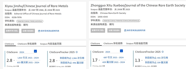 入选中文刊实现稳步提升。《稀有金属》《中国稀土学报》2024年度CiteScore™分别为2.8、1.7,同比提升27%、13%。