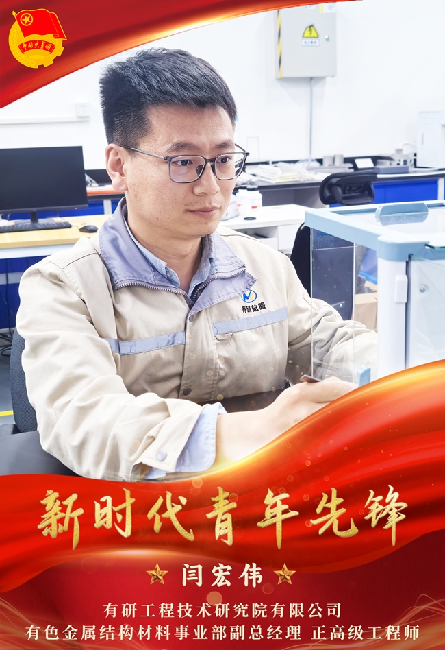 闫宏伟,中共党员,有研工研院有色金属结构材料事业部副总经理,正高级工程师,入选国家级青年人才计划、中国科协青年人才托举工程。他致力于先进铝合金、新型轻质合金材料与制备加工技术创新,面向航空航天、交通运输等领域高端装备轻量化需求,锐意创新、攻坚克难,以关键共性技术攻关支撑大飞机用铝合金厚板实现全面自主可控,以原始创新轻质高强铝合金材料支撑装备结构轻量化迭代升级。他负责或骨干参与大飞机材料专项、重点研发等国家级科研任务34项,获国家科技进步二等奖1项、中国有色金属工业科学技术奖4项;获评中央企业青年岗位能手、中国有研首届“有研工匠”等。