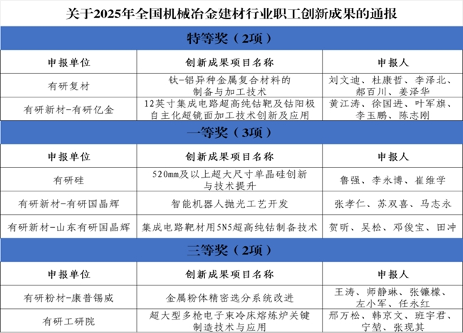 近日,2025年全国机械冶金建材行业职工创新成果评选揭晓,中国有研申报的7项职工创新成果均获奖,其中,特等奖2项、一等奖3项、三等奖2项。